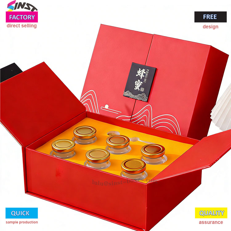 この赤い蜂蜜のギフトボックスは、エレガントな波模様と高品質の硬質ボール紙を組み合わせており、保管や持ち運びが簡単な折りたたみ構造が特徴です。ハニー ギフト ボックスは、さまざまなサイズのガラス瓶 (ハニー/トニック用) に対応しており、内容物を保持するためのカスタム フォーム インサートが付属しています。ホリデーギフト、ビジネスギフト、健康製品のパッケージに非常に適しており、ヨーロッパ、アメリカ、東南アジア市場のギフトの好みと一致しています。このボックスは軽量でスタイリッシュ、そしてコスト効率に優れ、商品価値も高めます。