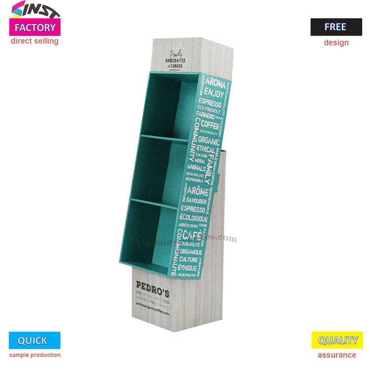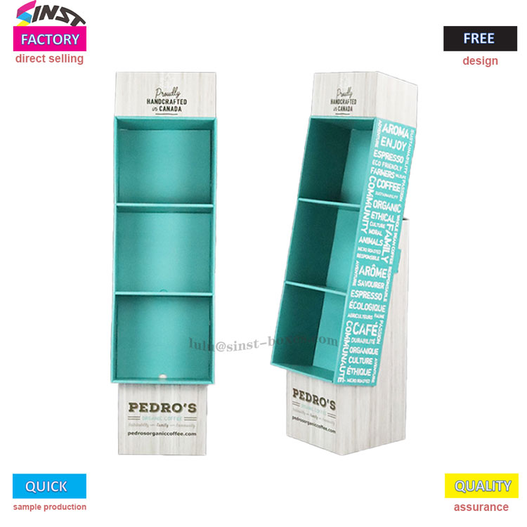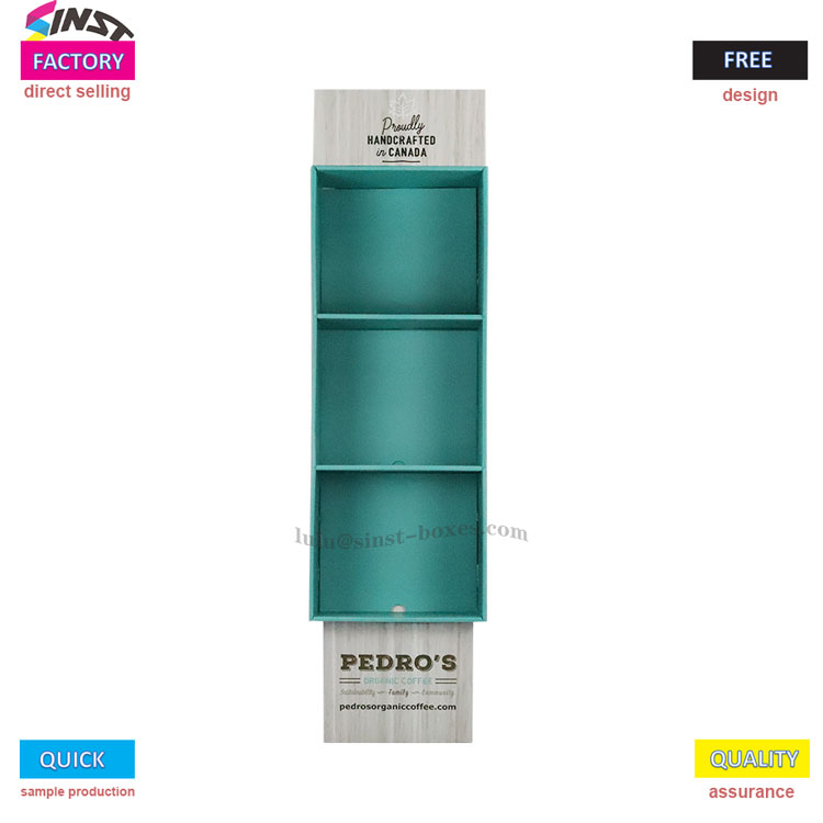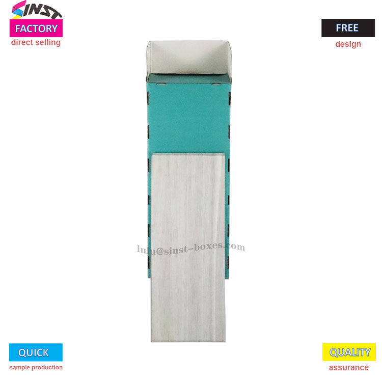 この文房具段ボールディスプレイラックは、主にさまざまな文房具アイテムを展示するために使用されます。本体全体は長方形で、明るい木材または白い木目調の素材で作られており、見た目はさわやかで質感があります。前面には緑または青緑の3つのオープン収納コンパートメントが特別にデザインされており、文房具の分類と保管に最適です。本でも、さまざまなノートでも、さまざまなスタイルのペンでも、すべてしっかりと中に入れることができます。また、このディスプレイラックはわずかに前傾した台形構造なので、力を入れずに商品を手に取りやすく、置きやすくなっています。
