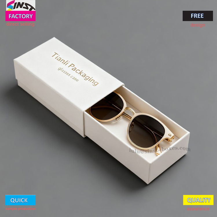 ホワイトのマットなボックス本体にゴールドのブランド文字を配した、「Less is more」を核にデザインされたメガネギフトボックスです。開くと、内部の正確な溝が金色の縁取りと深い茶色のレンズが付いたメガネをしっかりと保持します。毎日のメガネ保護ボックスであり、傷がつきにくく、圧迫されないだけでなく、簡単に持ち運べるポータブルメガネボックスでもあります。平らで四角い形状は、スペースをとらずにブリーフケースやポケットに収まります。ライトグレーの背景がすっきりとした質感を際立たせ、ビジネスシーンに持ち出すと「細部まで上質」な高級感を醸し出します。ビジネス用メガネケースと言っても過言ではありません。
