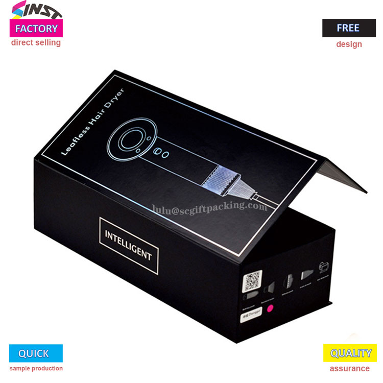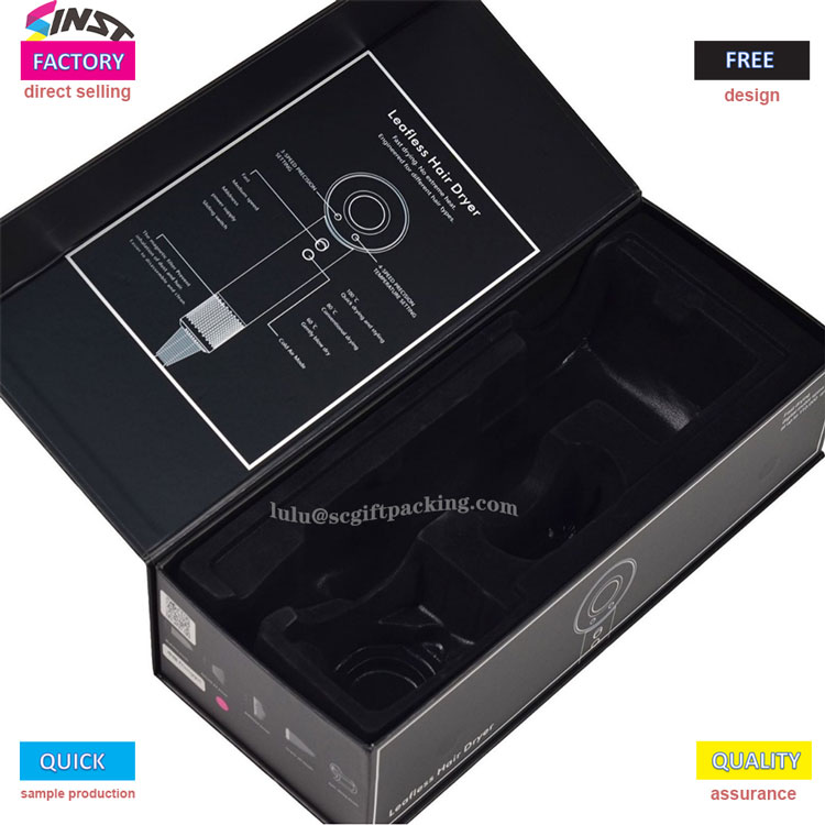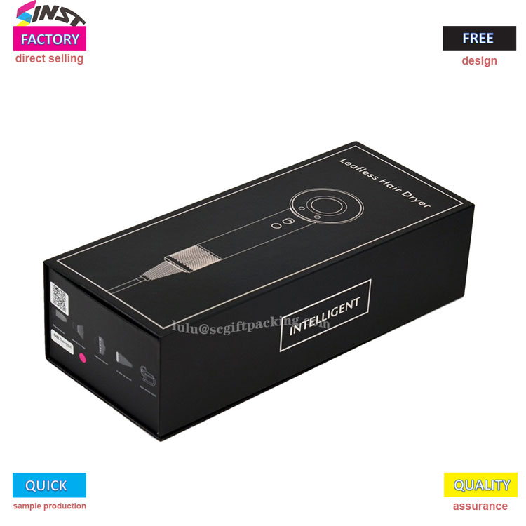 この黒いフリップカバーヘアドライヤーギフトボックスには、シンプルでエレガントなデザインがあります。ボックスカバーの内側には、ブランドロゴとさまざまな風速と温度制御が印刷されています。ギフトボックスの職人技は非常にテクスチャであり、排他的なストレージとギフト授与式の選択肢の両方です。